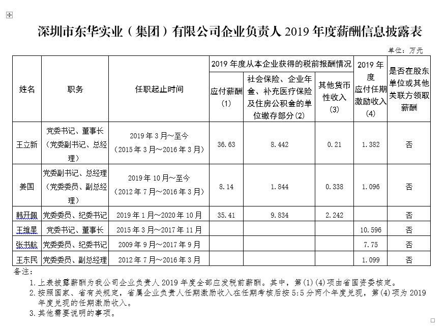 深圳市東華實(shí)業(yè)(集團(tuán))有限公司2019年度企業(yè)負(fù)責(zé)人薪酬披露