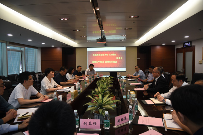 濰坊市駐深辦主任孫學(xué)明,濰坊市赴深圳學(xué)習(xí)歷練組部分成員;深圳市東華實業(yè)(集團(tuán))有限公司董秘、辦公室主任楊吉平,投資發(fā)展部部長張化勤,深圳市山東商會執(zhí)行秘書長陳振永參加座談。