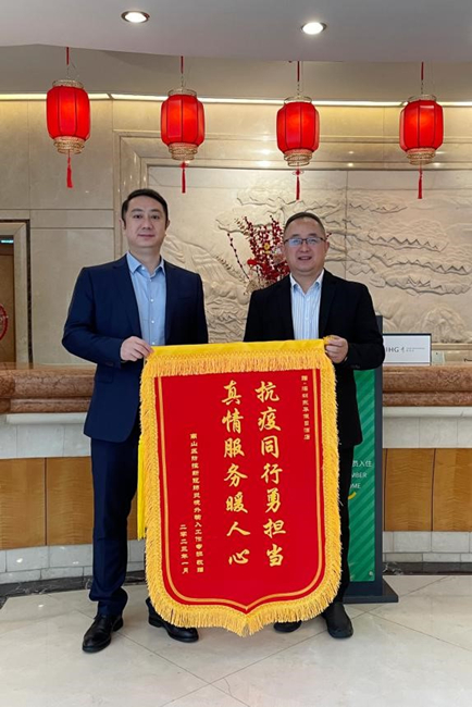 1月10日,深圳東華旗下東華假日酒店收到深圳市南山區(qū)防控新型冠狀病毒肺炎境外輸入工作專班送來(lái)的繡著“抗疫同行勇?lián)?dāng) 真情服務(wù)暖人心”的錦旗和感謝信,深圳東華黨委副書記、董事、總經(jīng)理劉立基代表公司接受工作專班負(fù)責(zé)人陳華巍局長(zhǎng)贈(zèng)與的錦旗。