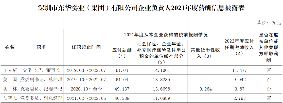 深圳市東華實(shí)業(yè)(集團(tuán))有限公司企業(yè)負(fù)責(zé)人2021年度薪酬信息披露