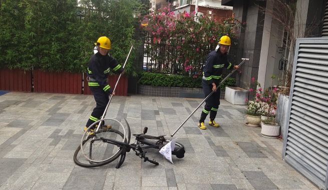 演練模擬充電樁處電動(dòng)車突發(fā)起火場(chǎng)景?;鹎榘l(fā)生后,值班保安迅速反應(yīng),第一時(shí)間趕赴現(xiàn)場(chǎng),切斷電源,隔離群眾。保安員迅速取來(lái)消防鉤,根據(jù)要求,將著火電動(dòng)車從充電樁處拉拽出來(lái),與周邊電動(dòng)自行車隔離,防止火勢(shì)蔓延。與此同時(shí),其他保安迅速提起滅火器,對(duì)準(zhǔn)火源根部噴射滅火。在團(tuán)隊(duì)緊密協(xié)作下,短短幾分鐘,明火被成功撲滅。